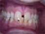 Improperly aligned and irregular shaped teeth. A shift left upper central incisor caused by the loss of the right central incisor.