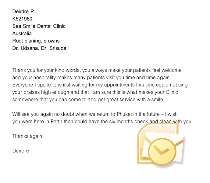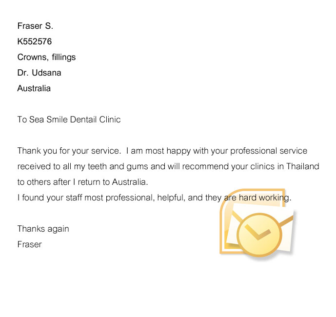 My experience at SEA SMILE DENTAL was a very positive one. My outcome, as I hope you can see, was excellent and I am so pleased with the whole experience. The front desk ladies and the dental assistants also deserve a well deserved "Thank You!". They were extremely helpful and caring too.